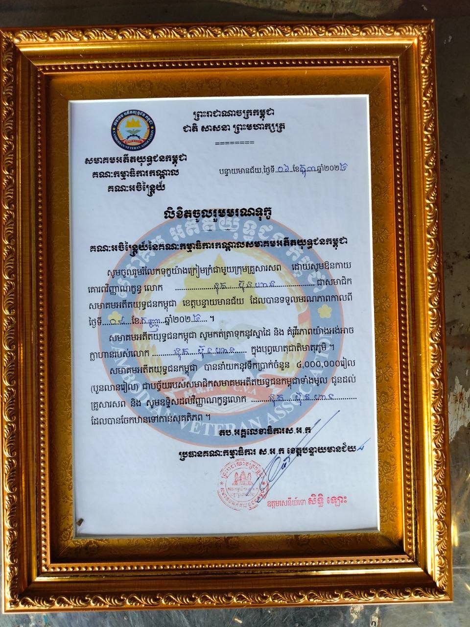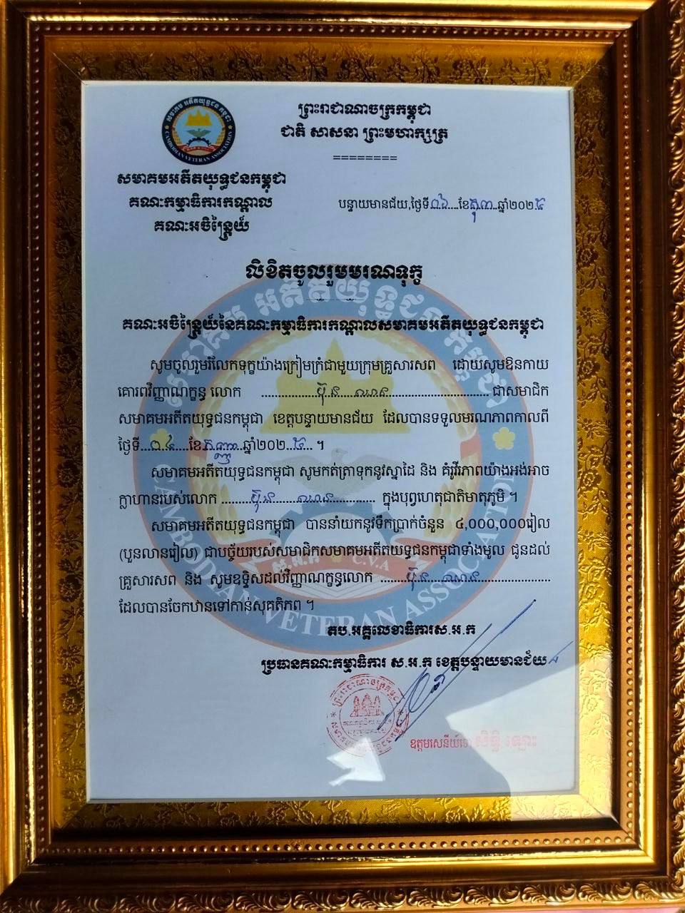 លោកស្រី ទួន សុគន្ធា តំណាងលោកឧត្ដមសេនីយ៍ទោ សិទ្ធិ ឡោះ ប្រធានអ.ន.ក ខេត្តបន្ទាយមានជ័យ នាថ្ងៃទី០៦ ខែតុលា ឆ្នាំ២០២៥ បានដឹកនាំក្រុមការងារនាំយកថវិកាបេឡាមរណសង្គ្រោះរបស់សមាគមអតីតយុទ្ធជន និងនិវត្តជនកម្ពុជា ចំនួន ៨លានរៀល និងលិខិតរំលែកមរណទុក្ខ ប្រគល់ជូនគ្រួសារសពសមាជិកសមាគអតីតយុទ្ធជនចំនួន ២ គ្រួសារក្នុងខេត្តបន្ទាយមានជ័យ ។