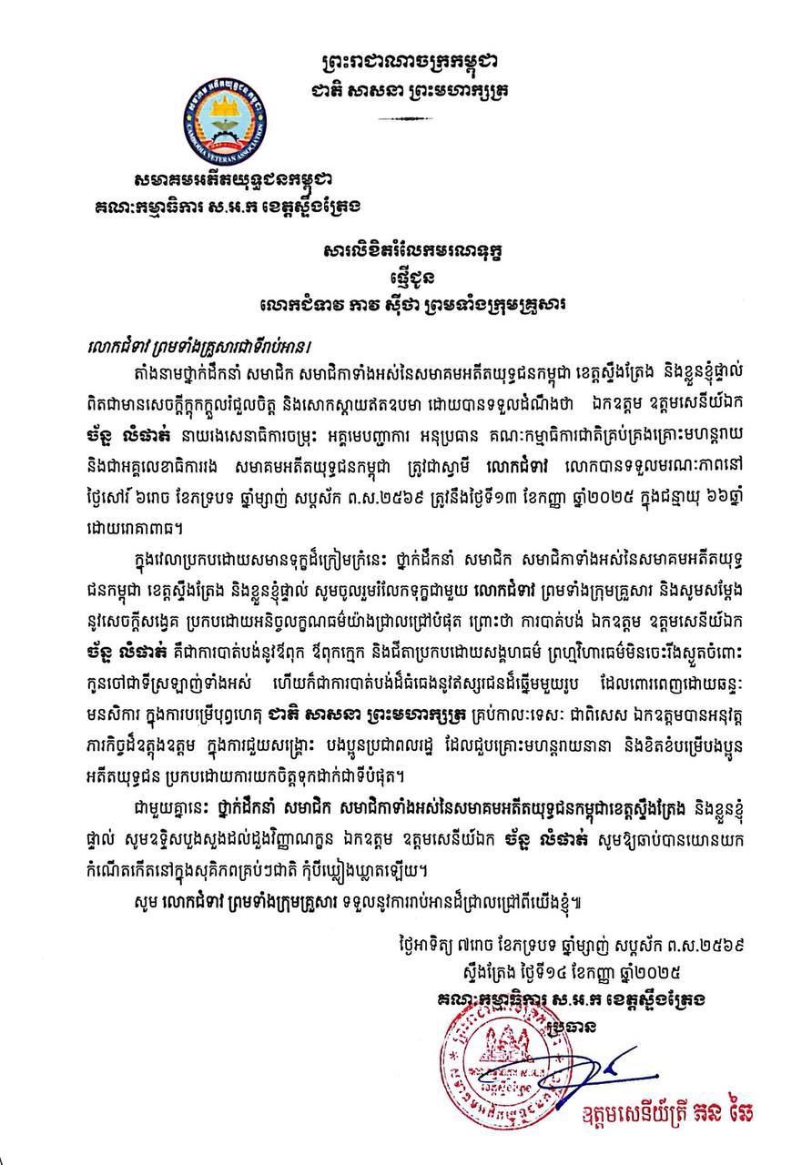 ថ្នាក់ដឹកនាំសមាគមអតីតយុទ្ធជន និងនិវត្តជនកម្ពុជា ផ្ញើសារគោរពជូនពរ សម្តេចកិត្តិព្រឹទ្ធបណ្ឌិត ប៊ុន រ៉ានី ក្នុងឱកាសចម្រើនជន្មាយុ