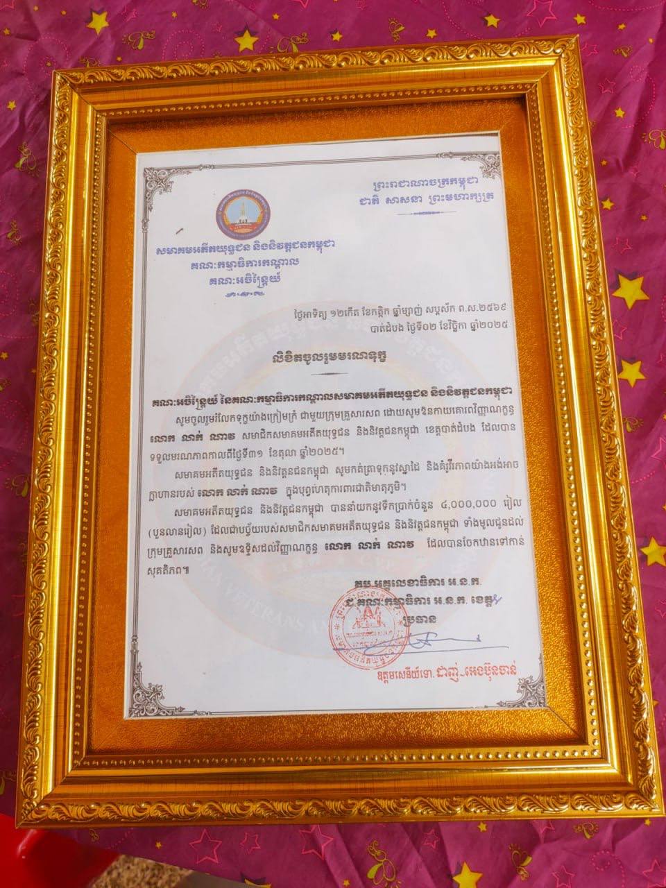 លោកវរសេនីយ៍ត្រី ថ ណៃ តំណាងលោកវរសេនីយ៍ឯក សុខ សារិន អធិការ នៃអធិការដ្ឋាននគរបាលស្រុក និងជាប្រធានសមាគមអតីតយុទ្ធជន និងនិវត្តជនកម្ពុជា ស្រុកបវេលនាថ្ងៃទី០២ ខែវិច្ឆិកា ឆ្នាំ២០២៥ បាននាំយកថវិកាបេឡាមរណសង្គ្រោះចំនួន ៤ លានរៀល ប្រគល់ជូនគ្រួសារសពអតីតយុទ្ធជន ឈ្មោះ លាក់ ណាវ ភេទប្រុស អាយុ ៨៥ឆ្នាំ រស់នៅភូមិស្ថាពរ១ ឃុំអំពិលប្រាំដើម ស្រុកបវេល ខេត្តបាត់ដំបង ដែលបានទទួលមរណភាពកាលពីថ្ងៃទី៣១ ខែតុលា ឆ្នាំ២០២៥។