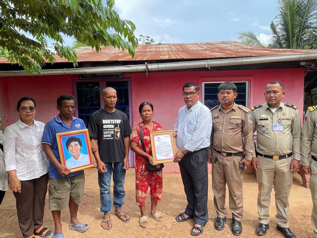 លោក ឡុង សុភឺន អភិបាលរងតំណាង លោក ទេព ហន អភិបាល នៃគណៈអភិបាលស្រុក និងជាប្រធានកិត្តិយសអ.ន.ក ស្រុកមោងឫស្សី ជាមួយលោកអនុសេនីយ៍ទោ សោម រ៉ាវុធ មេបញ្ជាការរងកងរាជអាវុធហត្ថស្រុក តំណាងលោកវរសេនីយ៍ត្រី លី គឹមហ៊ាង មេបញ្ជាការមូលដ្ឋានកងរាជអាវុធហត្ថស្រុក និងជាប្រធាន អ.ន.ក ស្រុកមោងឫស្សី នាថ្ងៃទី១៣ ខែតុលា ឆ្នាំ២០២៥ បានដឹកនាំក្រុមការងារនាំយកថវិកាបេឡាមរណសង្គ្រោះ ចំនួន ៤ លានរៀល ប្រគល់ជូនគ្រួសារអតីតយុទ្ធជន ឈ្មោះ វ៉ិត ប្រុញ ភេទប្រុស អាយុ ៥១ឆ្នាំ រស់នៅភូមិកកោះ ឃុំកកោះ ស្រុកមោងឫស្សី ខេត្តបាត់ដំបង ដែលបានទទួលមរណភាពដោយរោគាពាធកាលពីថ្ងៃទី០៩ ខែតុលា ឆ្នាំ២០២៥។
