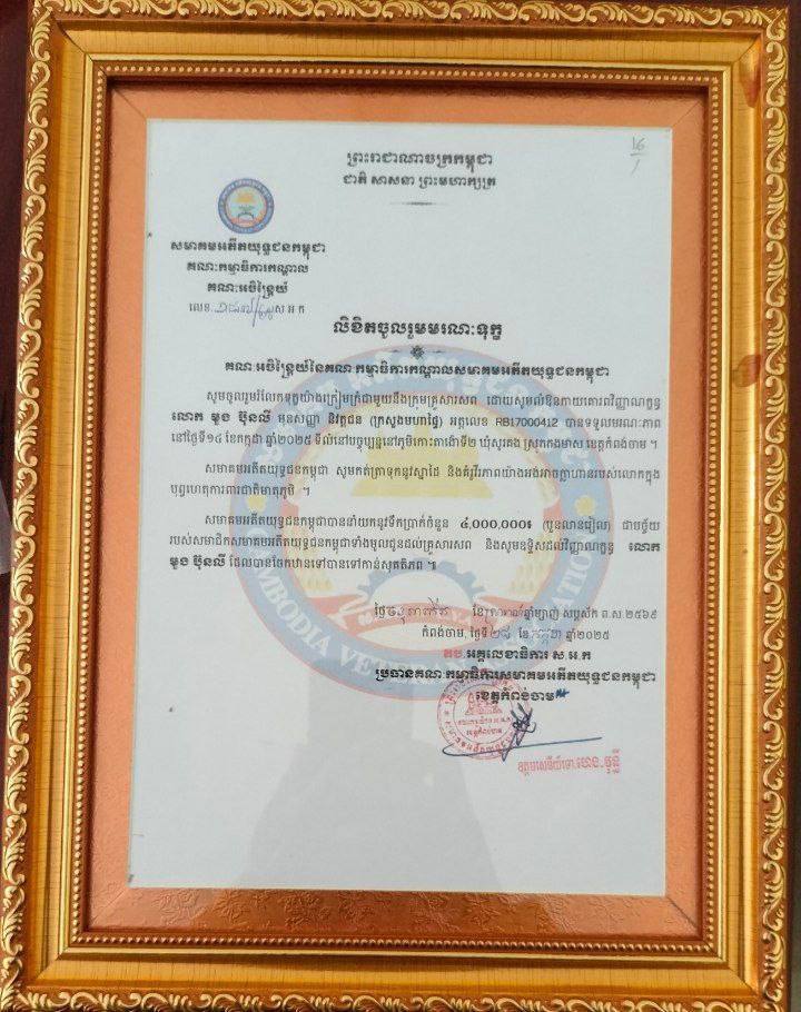 ឧត្តមសេនីយ៍ទោ ហេង វុទ្ធី ប្រធានគណៈកម្មាធិការ ស.អ.ក ខេត្តកំពង់ចាម នៅថ្ងៃទី០៦ ខែសីហា ឆ្នាំ២០២៥ បានចាត់ឱ្យក្រុមការងារសមាគមស្រុកកងមាស នាំយកថវិកាបេឡាមរណសង្គ្រោះ ចំនួន ៤លានរៀល ប្រគល់ជូនដល់គ្រួសារសពអតីតយុទ្ធជនមួយគ្រួសារ ស្ថិតនៅស្រុកកងមាស ខេត្តកំពង់ចាម ។