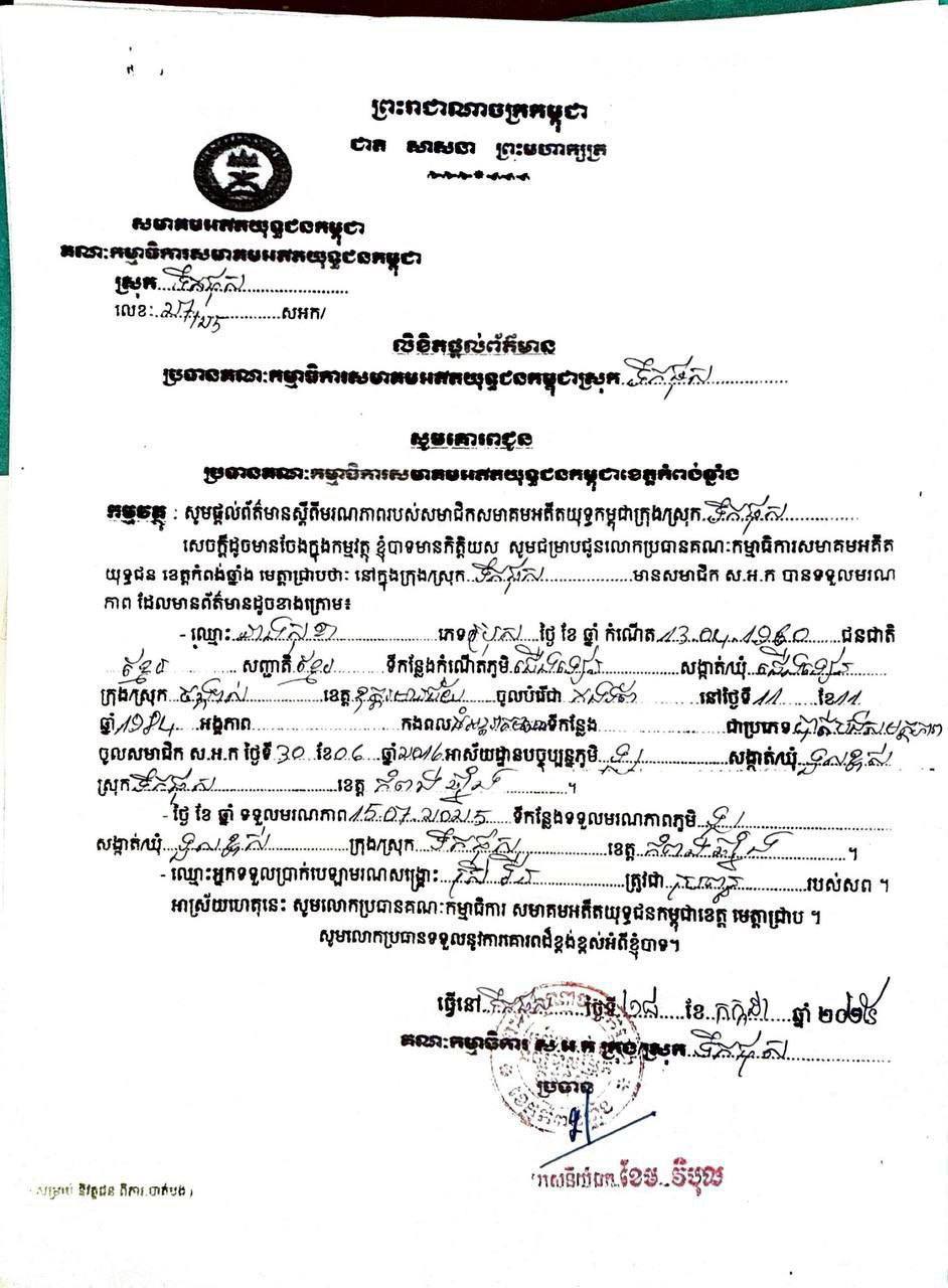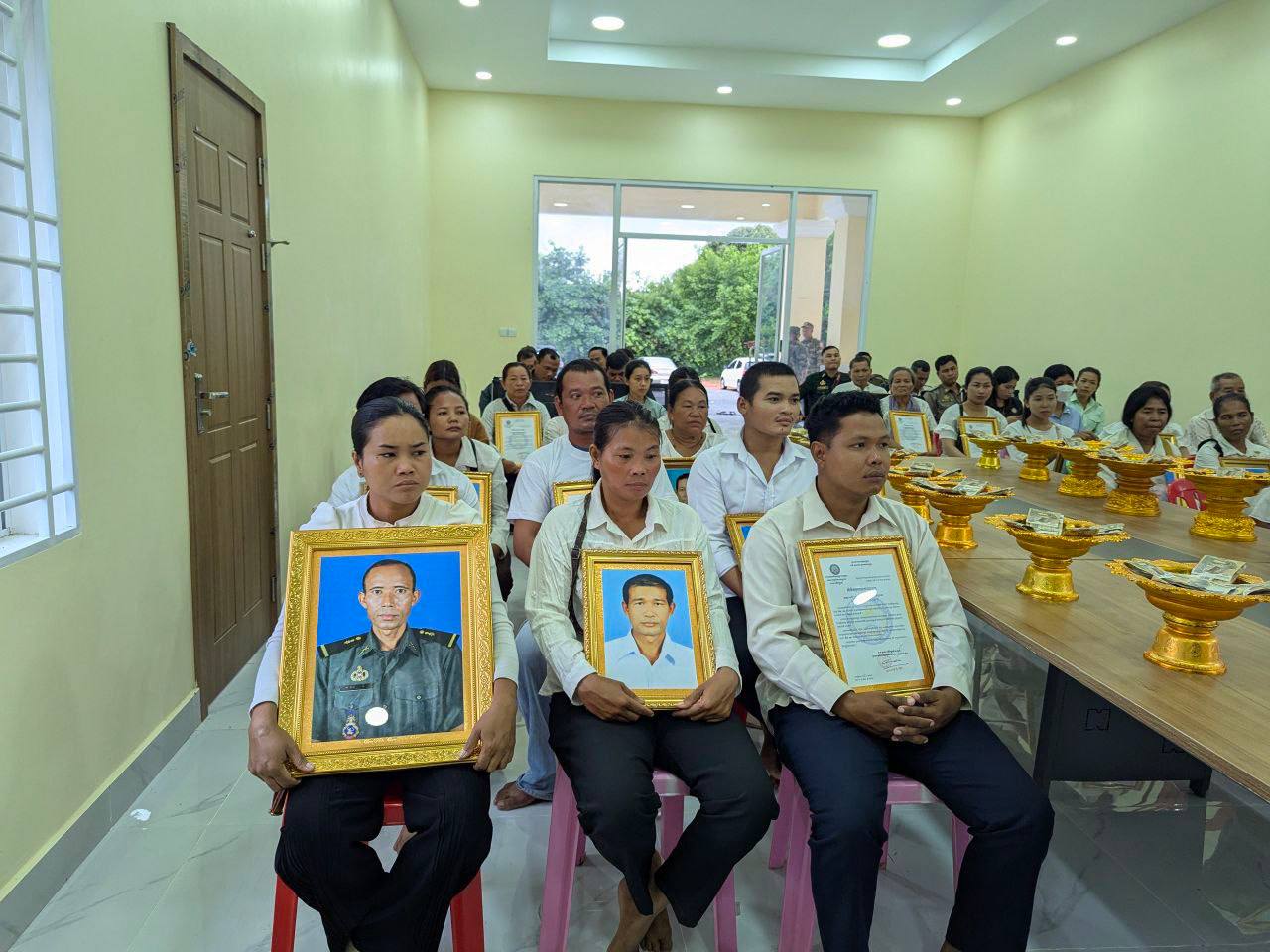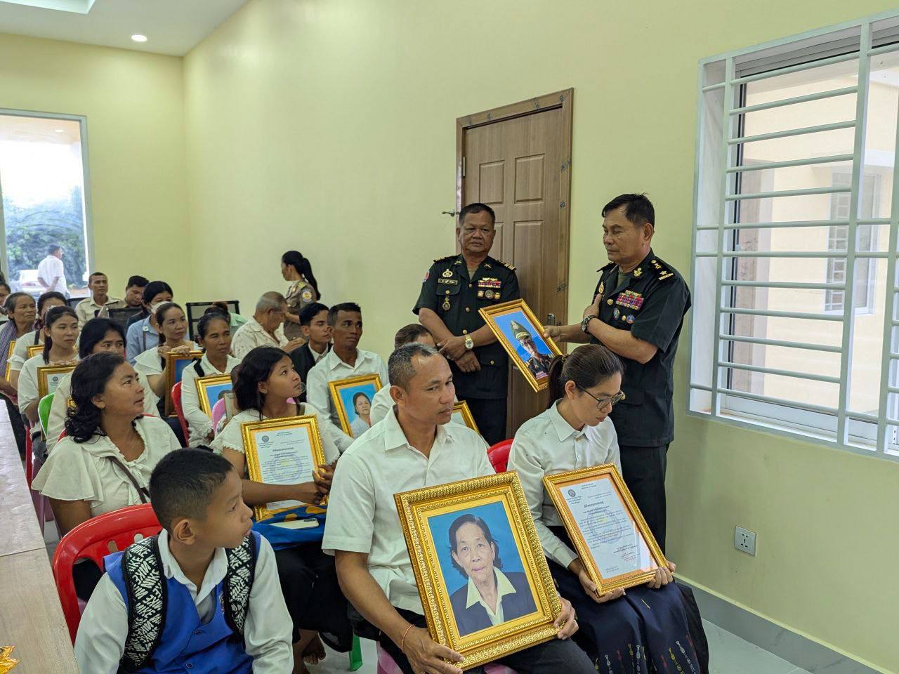 ឧត្តមសេនីយ៍ត្រី អ៊ុំ សុភា មេបញ្ជាការ តំបន់ប្រតិបត្តិការសឹករងកំពង់ឆ្នាំង និងជាប្រធានស.អ.ក ខេត្ត អមជាមួយលោក ឈាង ចន្ធី ប្រធានមន្ទីរសង្គមកិច្ច អតីតយុទ្ធជន និងយុវនីតិសម្បទា និងជាអនុប្រធានអចិន្ត្រៃយ៍ ស.អ.ក ខេត្តកំពង់ឆ្នាំង នាថ្ងៃទី១១ ខែសីហា ឆ្នាំ២០២៥នេះ បានដឹកនាំក្រុមការងារ និងអាជ្ញាធរមូលដ្ឋាននាំយកថវិកាបេឡាមរណសង្គ្រោះ ចំនួន ៦៤លានរៀល និងលិខិតរំលែកមរណទុក្ខ ប្រគល់ជូនគ្រួសារសពអតីតយុទ្ធជនកម្ពុជា ចំនួន១៦គ្រួសារ ក្នុងខេត្តកំពង់ឆ្នាំង។
