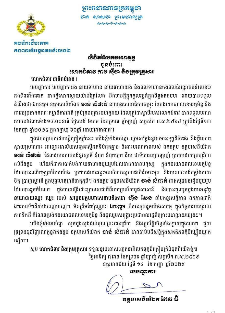 ឧត្តមសេនីយ៍ឯក កែវ ធី មេបញ្ជាការ កងពលធំអន្តរាគមន៍លេខ២ ផ្ញើសាររំលែកមរណទុក្ខគ្រួសារសព ឯកឧត្តម ឧត្តមសេនីយ៍ឯក ច័ន្ទ លំផាត់ នាយរងសេនាធិការចម្រុះនៃកងយោធពលខេមរភូមិន្ទ។