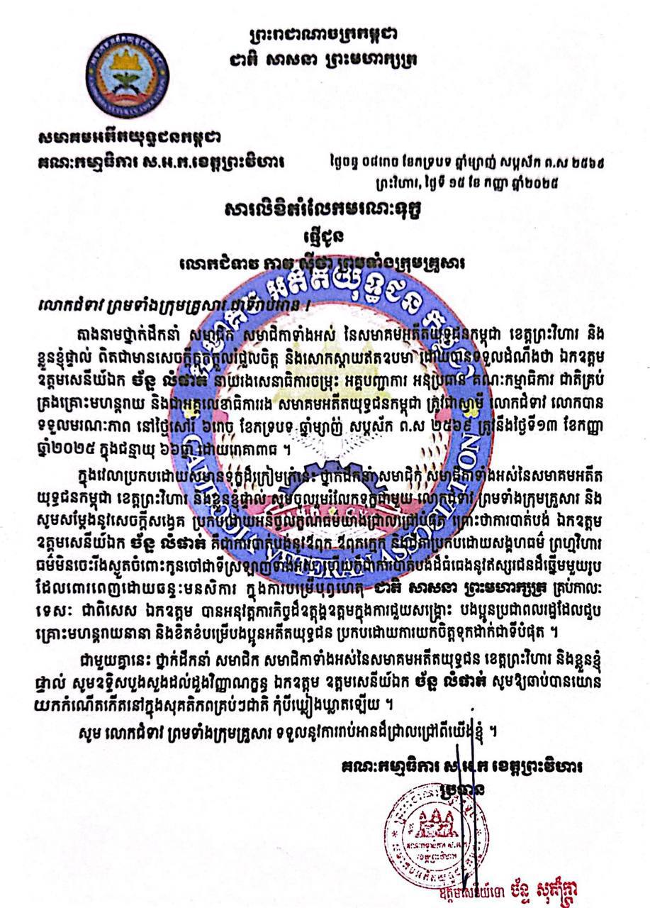 ឧត្តមសេនីយ៍ទោ ច័ន្ទ សុភ័ក្រ្តា ប្រធានសមាគមអតីតយុទ្ធជនកម្ពុជាខេត្តព្រះវិហារ ផ្ញើសាររំលែកមរណទុក្ខគ្រួសារសព ឯកឧត្តម ឧត្តមសេនីយ៍ឯក ច័ន្ទ លំផាត់ នាយរងសេនាធិការចម្រុះនៃកងយោធពលខេមរភូមិន្ទ, ជាអនុប្រធានគណៈកម្មាធិការជាតិគ្រប់គ្រងគ្រោះមហន្តរាយ និងជាអគ្គលេខាធិការរង ស.អ.ក។
