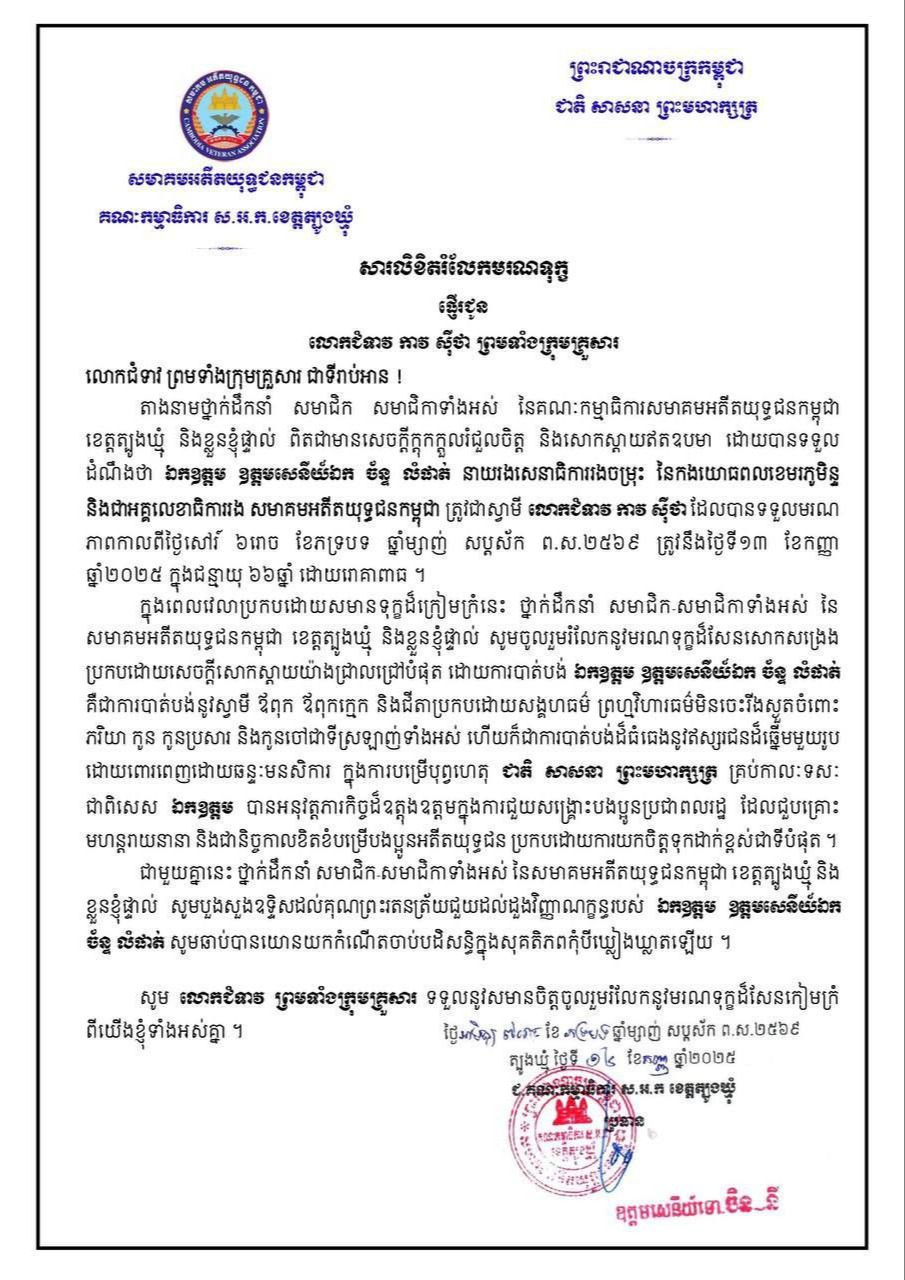 លោកឧត្តមសេនីយ៍ទោ ចិន នី ប្រធាន ស.អ.ក ខេត្តត្បូងឃ្មុំ ផ្ញើសាររំលែកមរណទុក្ខគ្រួសារសព ឯកឧត្តម ឧត្តមសេនីយ៍ឯក ច័ន្ទ លំផាត់ នាយរងសេនាធិការចម្រុះនៃកងយោធពលខេមរភូមិន្ទ។