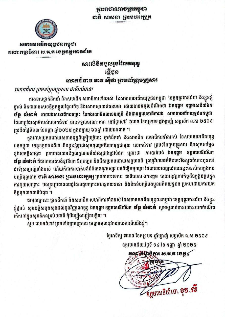 ថ្នាក់ដឹកនាំសមាគមអតីតយុទ្ធជន និងនិវត្តជនកម្ពុជា ផ្ញើសារគោរពជូនពរ សម្តេចកិត្តិព្រឹទ្ធបណ្ឌិត ប៊ុន រ៉ានី ក្នុងឱកាសចម្រើនជន្មាយុ