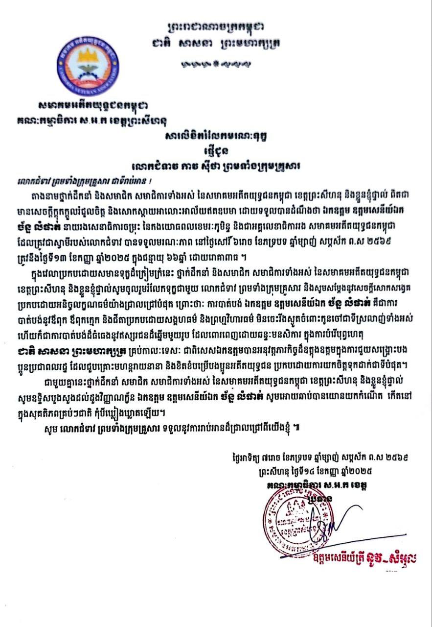 លោកឧត្តមសេនីយ៍ទោ នូវ សំអុល ប្រធាន ស.អ.ក ខេត្តព្រះសីហនុ ផ្ញើសាររំលែកមរណទុក្ខគ្រួសារសព ឯកឧត្តម ឧត្តមសេនីយ៍ឯក ច័ន្ទ លំផាត់ នាយរងសេនាធិការចម្រុះនៃកងយោធពលខេមរភូមិន្ទ។