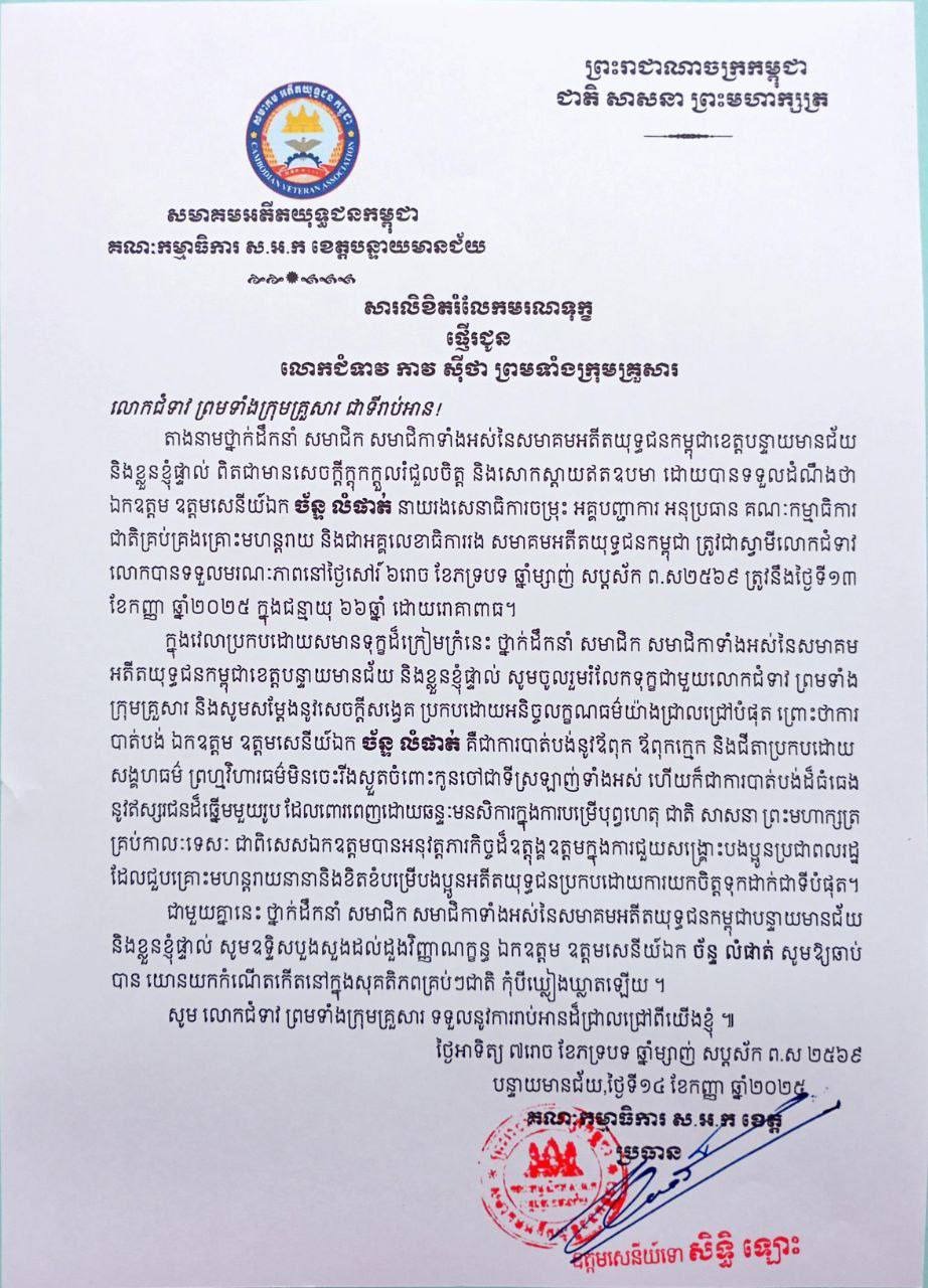 លោកឧត្តមសេនីយ៍ទោ សិទ្ធិ ឡោះ ប្រធាន ស.អ.ក ខេត្តបន្ទាយមានជ័យ ផ្ញើសាររំលែកមរណទុក្ខគ្រួសារសព ឯកឧត្តម ឧត្តមសេនីយ៍ឯក ច័ន្ទ លំផាត់ នាយរងសេនាធិការចម្រុះនៃកងយោធពលខេមរភូមិន្ទ។