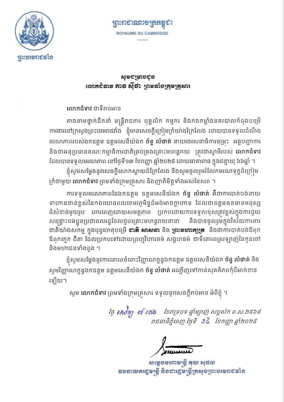 សម្ដេចមហាមន្រ្តី គុយ សុផល ឧបនាយករដ្ឋមន្ត្រី និងជារដ្ឋមន្រ្តីក្រសួងព្រះបរមរាំងវាំង ផ្ញើសាររំលែកមរណទុក្ខគ្រួសារសព ឯកឧត្តម ឧត្តមសេនីយ៍ឯក ច័ន្ទ លំផាត់ នាយរងសេនាធិការចម្រុះនៃកងយោធពលខេមរភូមិន្ទ, ជាអនុប្រធានគណៈកម្មាធិការជាតិគ្រប់គ្រងគ្រោះមហន្តរាយ និងជាអគ្គលេខាធិការរង ស.អ.ក។