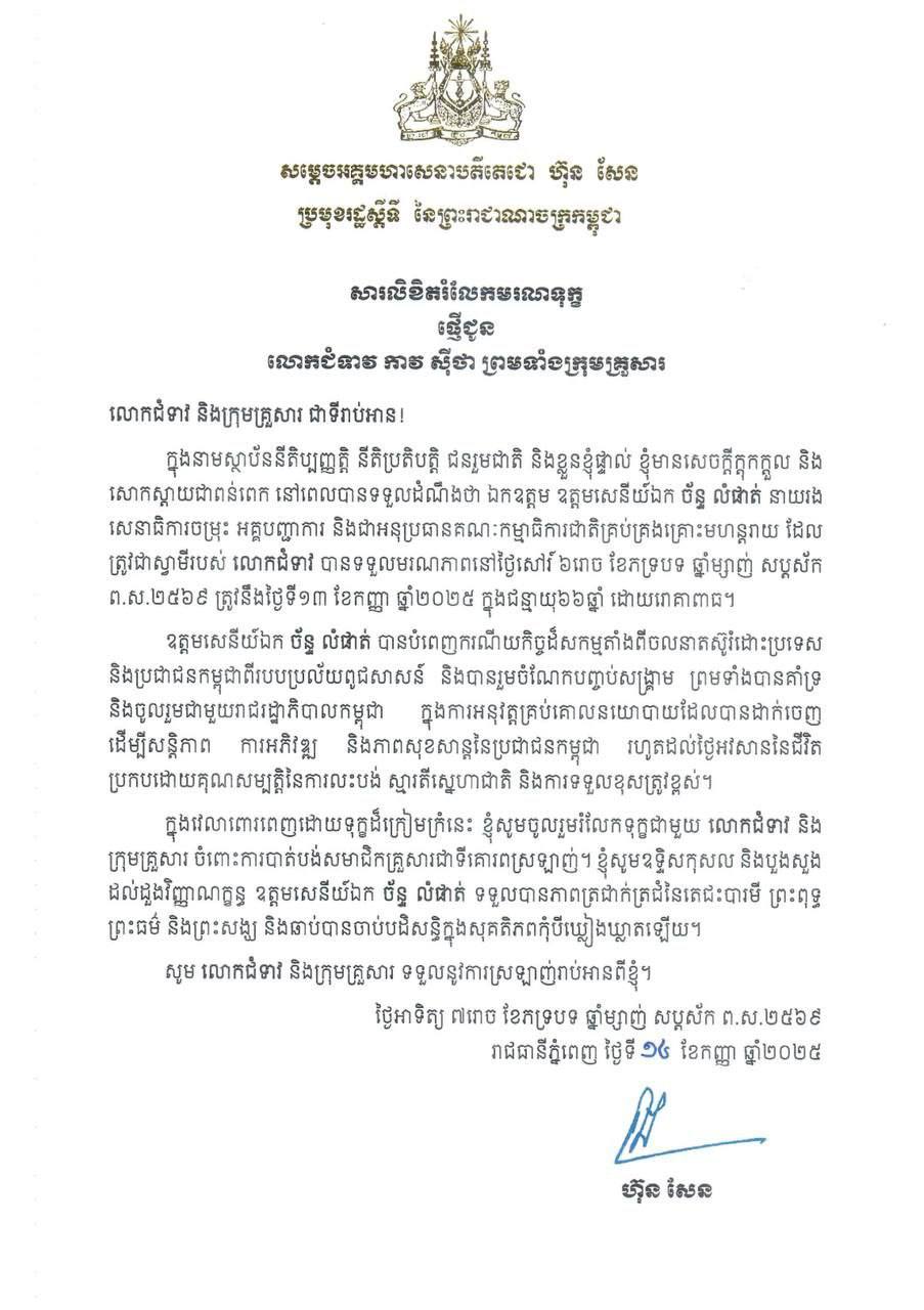 សម្តេចអគ្គមហាសេនាបតីតេជោ ហ៊ុន សែន ប្រមុខរដ្ឋស្តីទីនៃព្រះរាជាណាចក្រកម្ពុជា ផ្ញើសារលិខិតរំលែកទុក្ខជូន លោកជំទាវ កាវ ស៊ីថា ព្រមទាំងក្រុមគ្រួសារ ចំពោះមរណភាពឯកឧត្តម ច័ន្ទ លំផាត់ នាយរងសេនាធិការចម្រុះ អគ្គបញ្ជាការ និងជាអនុប្រធានគណៈកម្មាធិការជាតិគ្រប់គ្រងគ្រោះមហន្តរាយ។