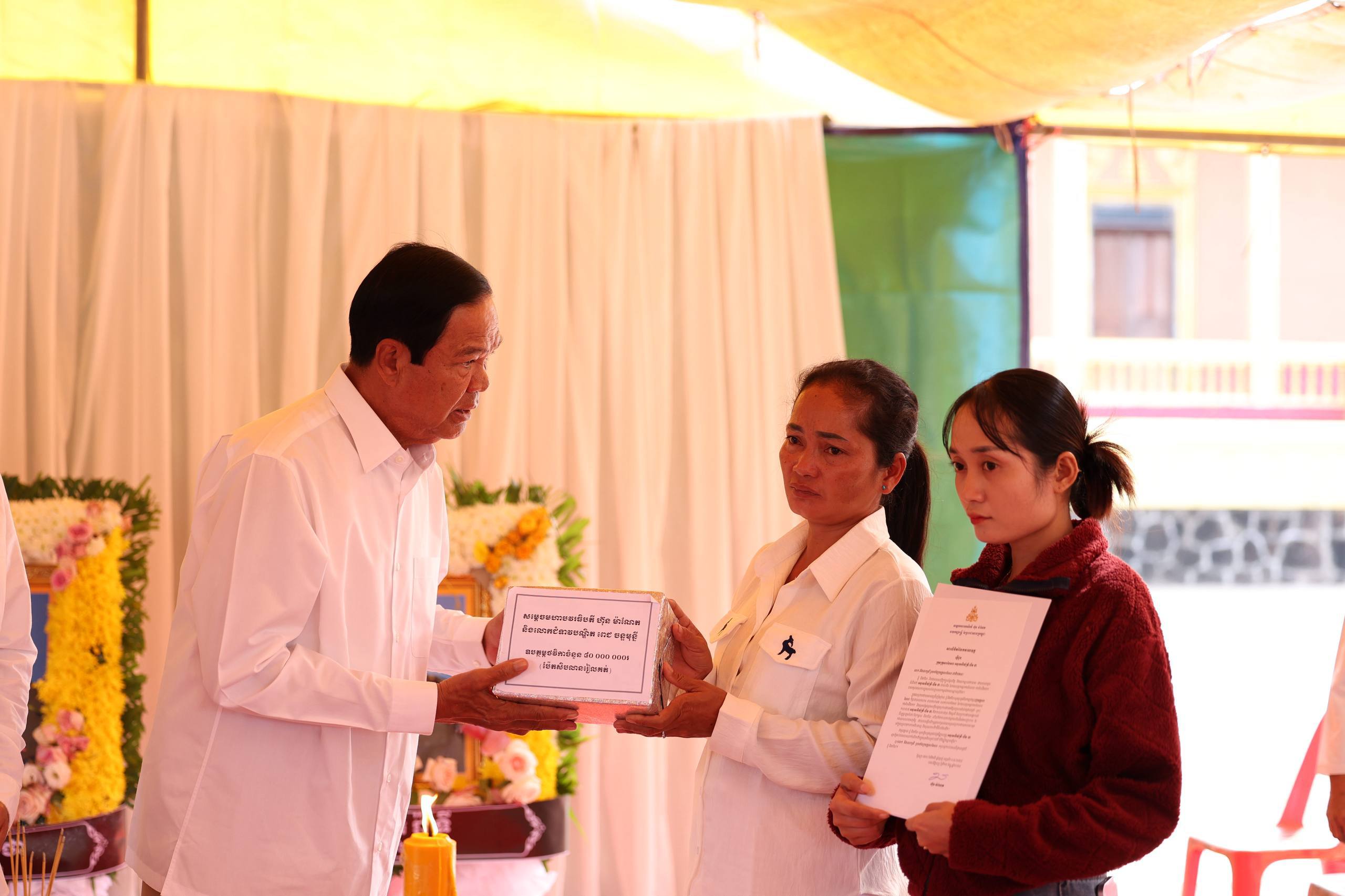 ឆ្លៀតក្នុងឱកាសនេះ ឯកឧត្តម ទេសរដ្ឋមន្រ្តី បានប្រគល់ថវិការបស់ សម្តេចមហាបវរធិបតី ហ៊ុន ម៉ាណែត ជូនគ្រួសារនៃសព ដោយក្នុងមួយគ្រួសារសពទទួលបានចំនួន ៨០លានរៀល និងព្រមទាំងបានប្រគល់ថវិកាជូនគ្រួសារ ដែលជាប្រជាពលរដ្ឋស៊ីវិលចំនួន ២រូបបានបាត់បង់ជីវិត ដោយក្នុងមួយគ្រួសារសពទទួលបានចំនួន ៤០លានរៀល៕