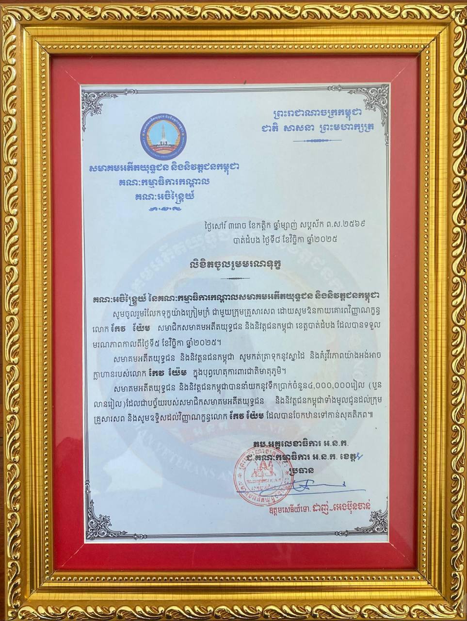 អ.ន.ក. ស្រុកបាណន់ នាំយកថវិកាបេឡាមរណសង្គ្រោះជូនគ្រួសារសពអតីតយុទ្ធជនមួយគ្រួសារ
