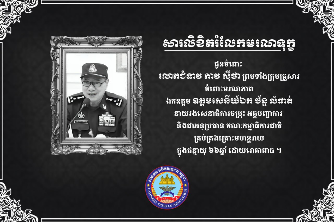 គណៈកម្មាធិការកណ្ដាលសមាគមអតីតយុទ្ធជនកម្ពុជាផ្ញើសារចូលរួមរំលែកមរណទុក្ខជូនចំពោះ លោកជំទាវ កាវ ស៊ីថា ព្រមទាំងក្រុមគ្រួសារ ចំពោះមរណភាព ឯកឧត្តម ឧត្តមសេនីយ៍ឯក ច័ន្ទ លំផាត់ នាយរងសេនាធិការចម្រុះនៃកងយោធពលខេមរភូមិន្ទ និងជាអនុប្រធាន គណៈកម្មាធិការជាតិគ្រប់គ្រងគ្រោះមហន្តរាយ។